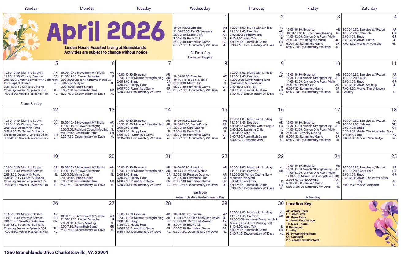 Branchlands offers over forty programs weekly such as live music, bingo, happy hour, mahjong, exercise classes, and movies. Programs are designed to encourage engagement, physical activity, and psychological well-being and maximize autonomy and a sense of accomplishment. Staff is always on hand with a supportive attitude and a friendly willingness, whenever assistance is needed. This “person-centered” approach supports whatever level of independence a resident is able to maintain—while, at all times respecting privacy and preserving dignity.